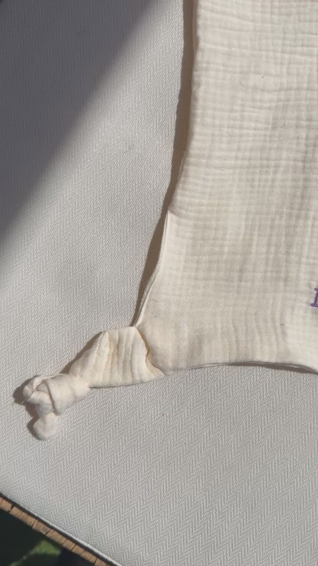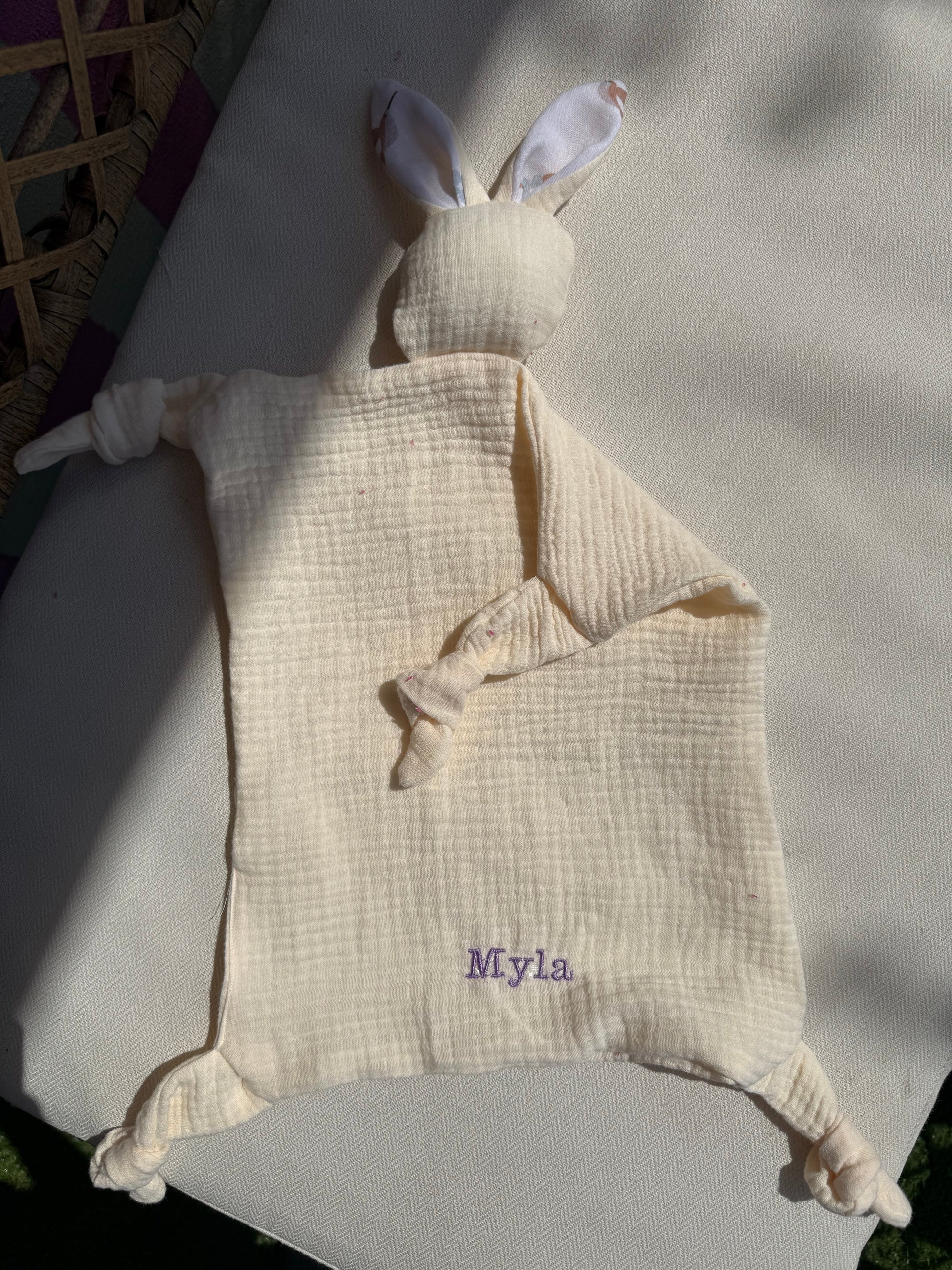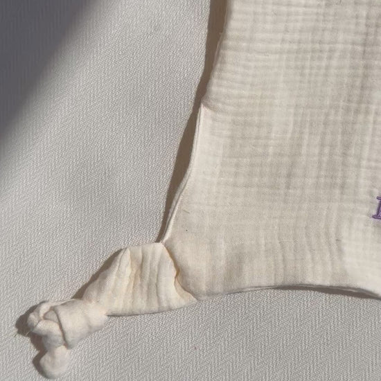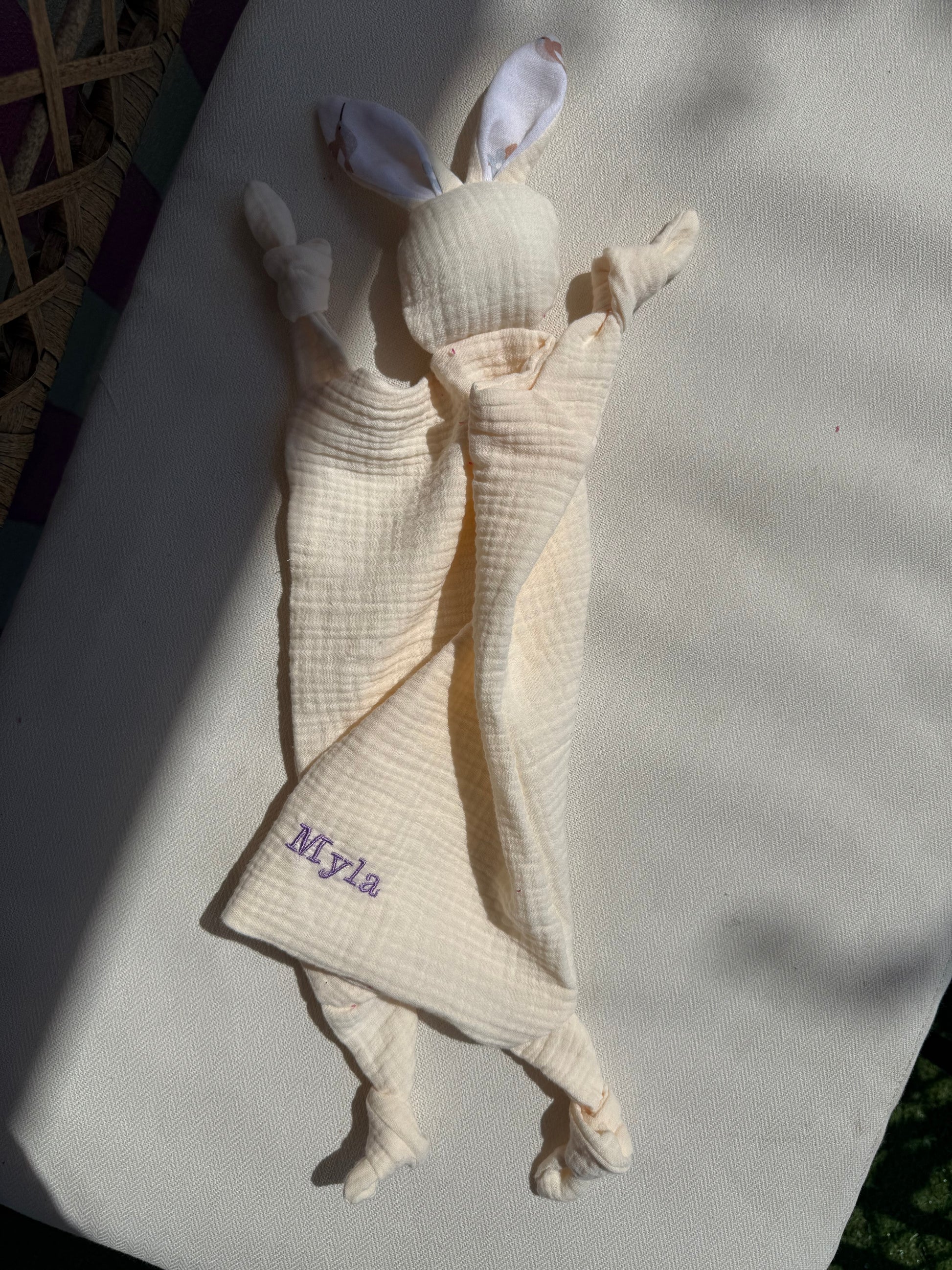 Cousu à la main dans notre atelier, ce doudou en double gaze de coton se distingue par sa légèreté, sa douceur et ses détails soignés : de jolies oreilles de lapin, quatre petits nœuds à attraper, et une broderie personnalisée au prénom de l’enfant.