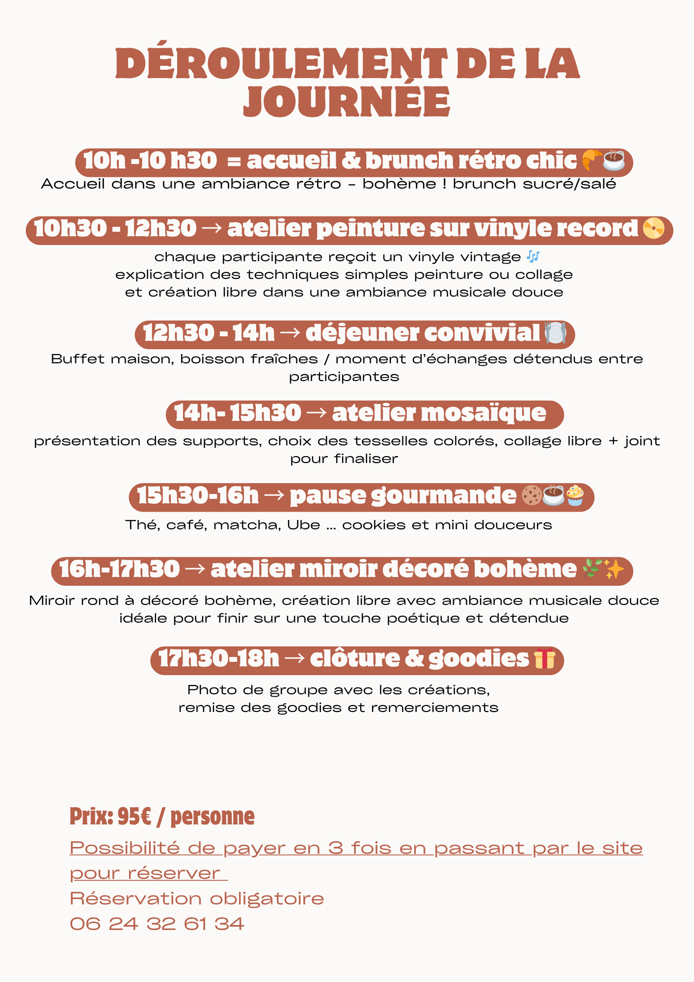 plongée dans une journée unique, mêlant, créativité, détente et ambiance rétro–bohème🌸 dans un cadre chaleureux à Mezzavia, Profitez de trois ateliers originaux d’un brunch et déjeuner et repartez avec vos Creations, plus de jolies surprises ✨