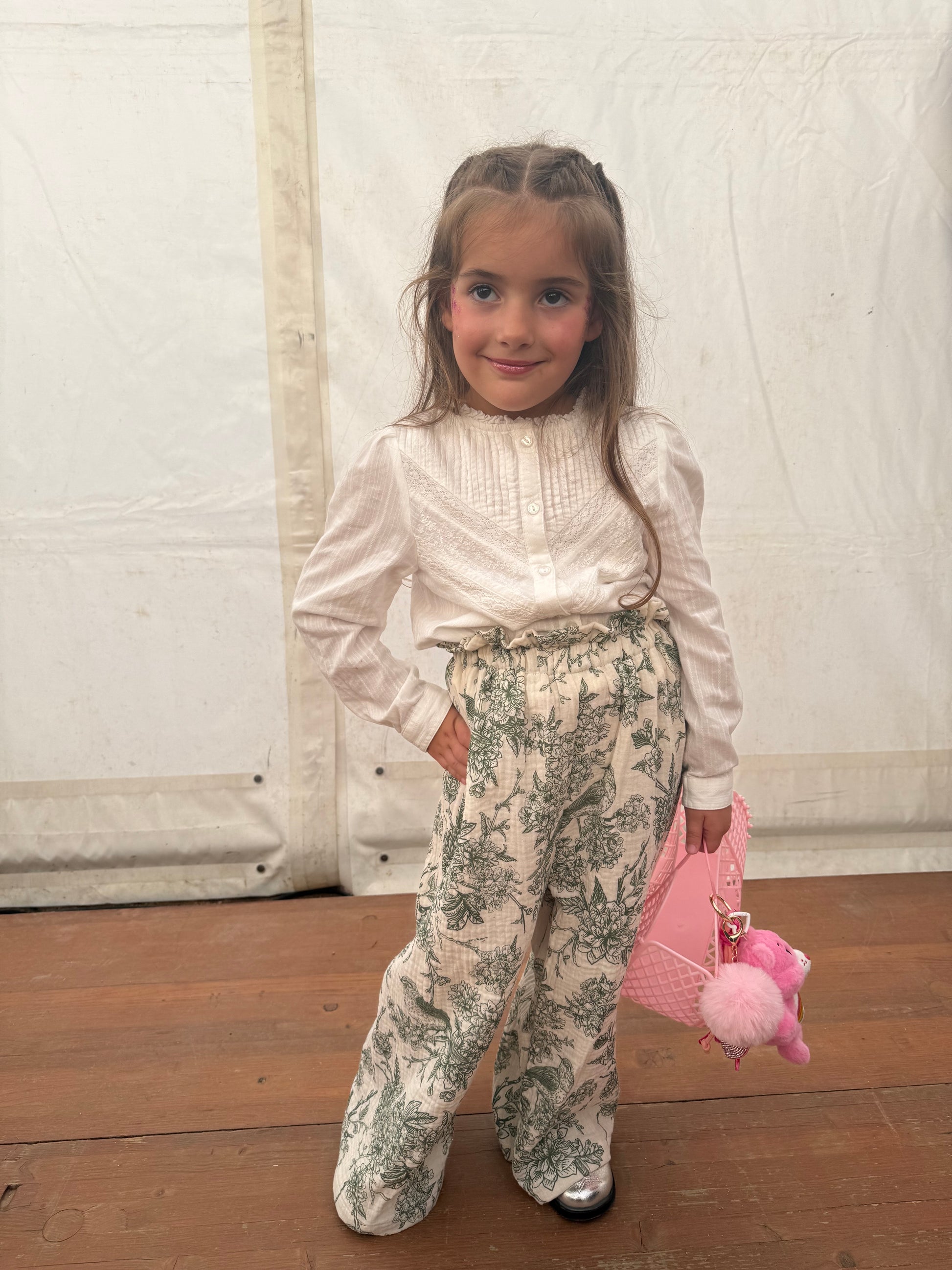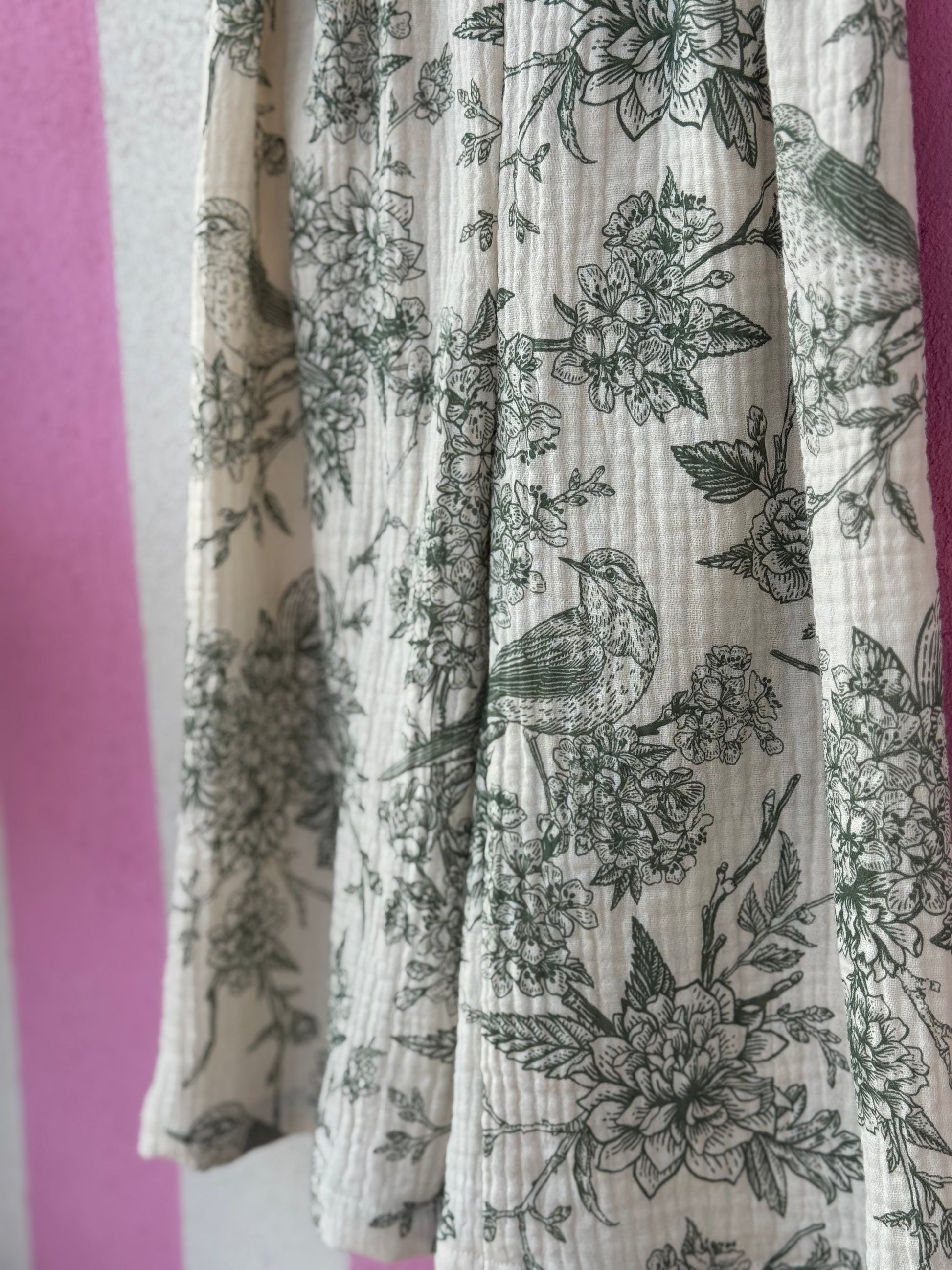 Son imprimé botanique aux détails raffinés, mêlant fleurs et oiseaux dans des tons verts délicats sur fond écru, apporte une touche poétique et intemporelle. Sa taille élastiquée garantit un confort optimal et une adaptation parfaite à la morphologie de l’enfant.