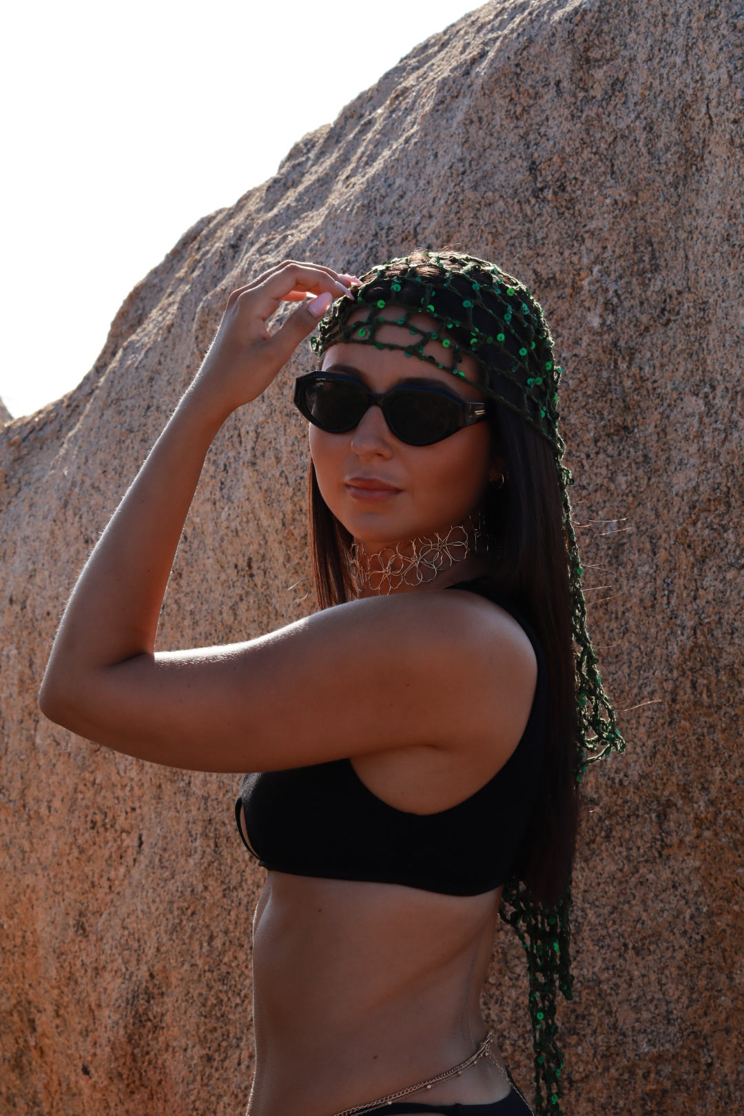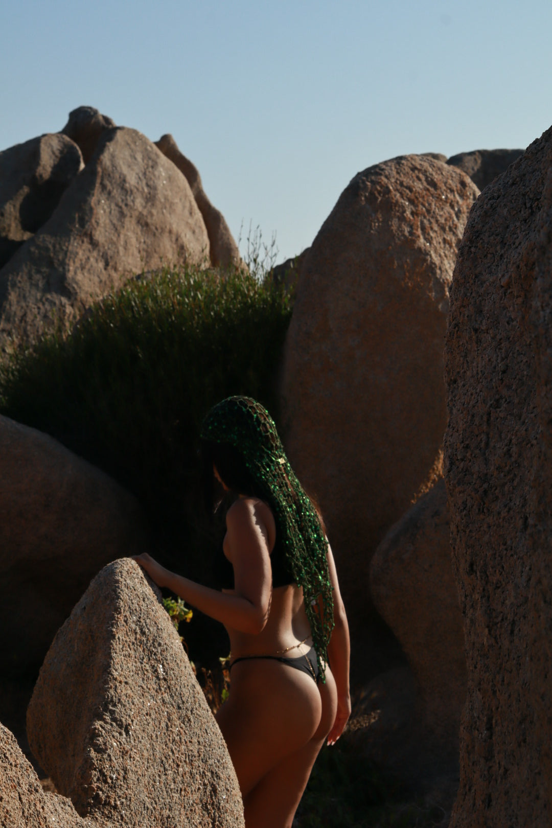 Le paréo ghjulia est un paréo 100% coton kaki à sequins brillant, c’est une pièce unique qui peut se porter aussi bien en bandana, ou en haut croisé sur le devant