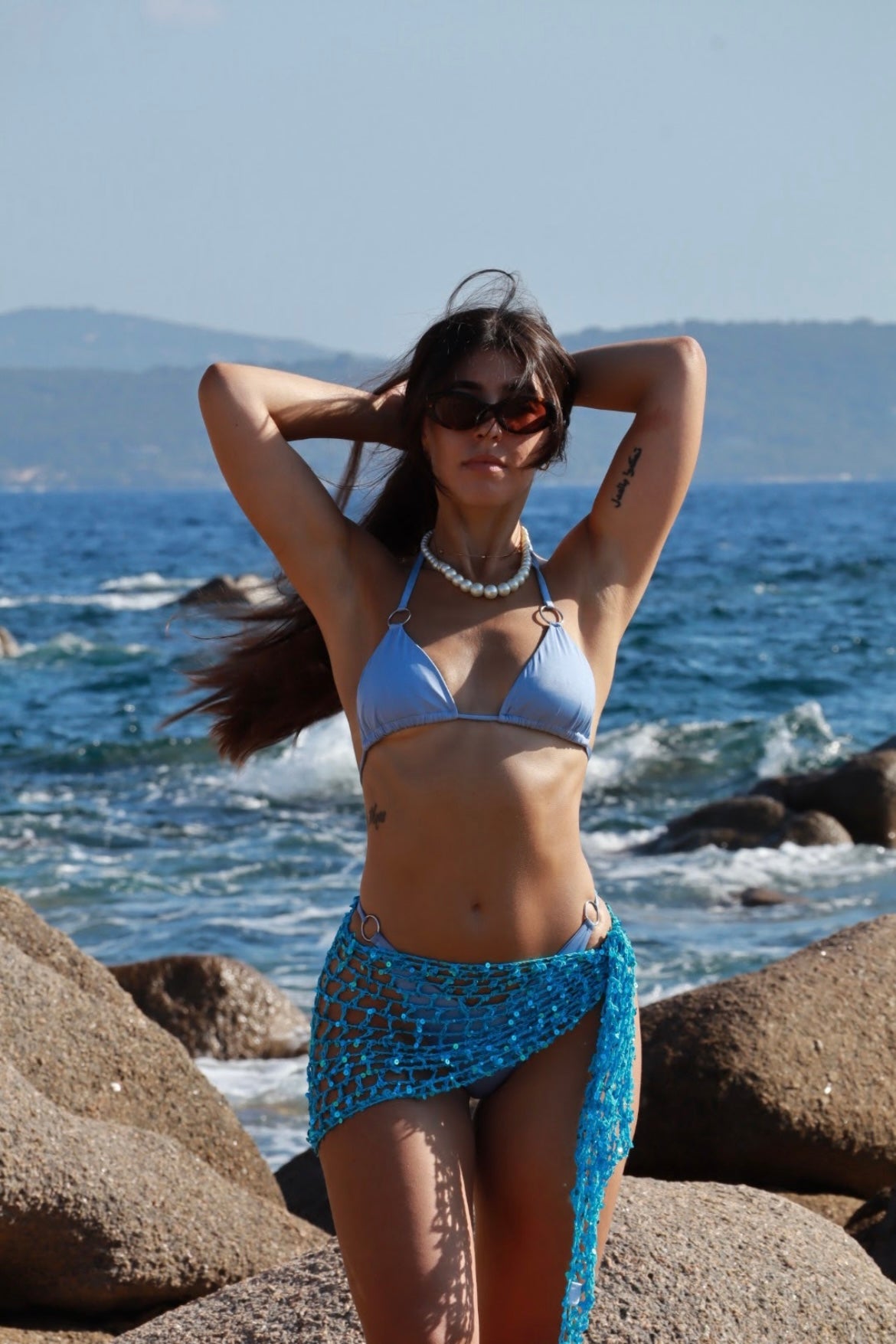 Le paréo ghjulia est un paréo 100% coton bleu éléctrique à sequins brillant, c’est une pièce unique qui peut se porter aussi bien en bandana, ou en haut croisé sur le devant