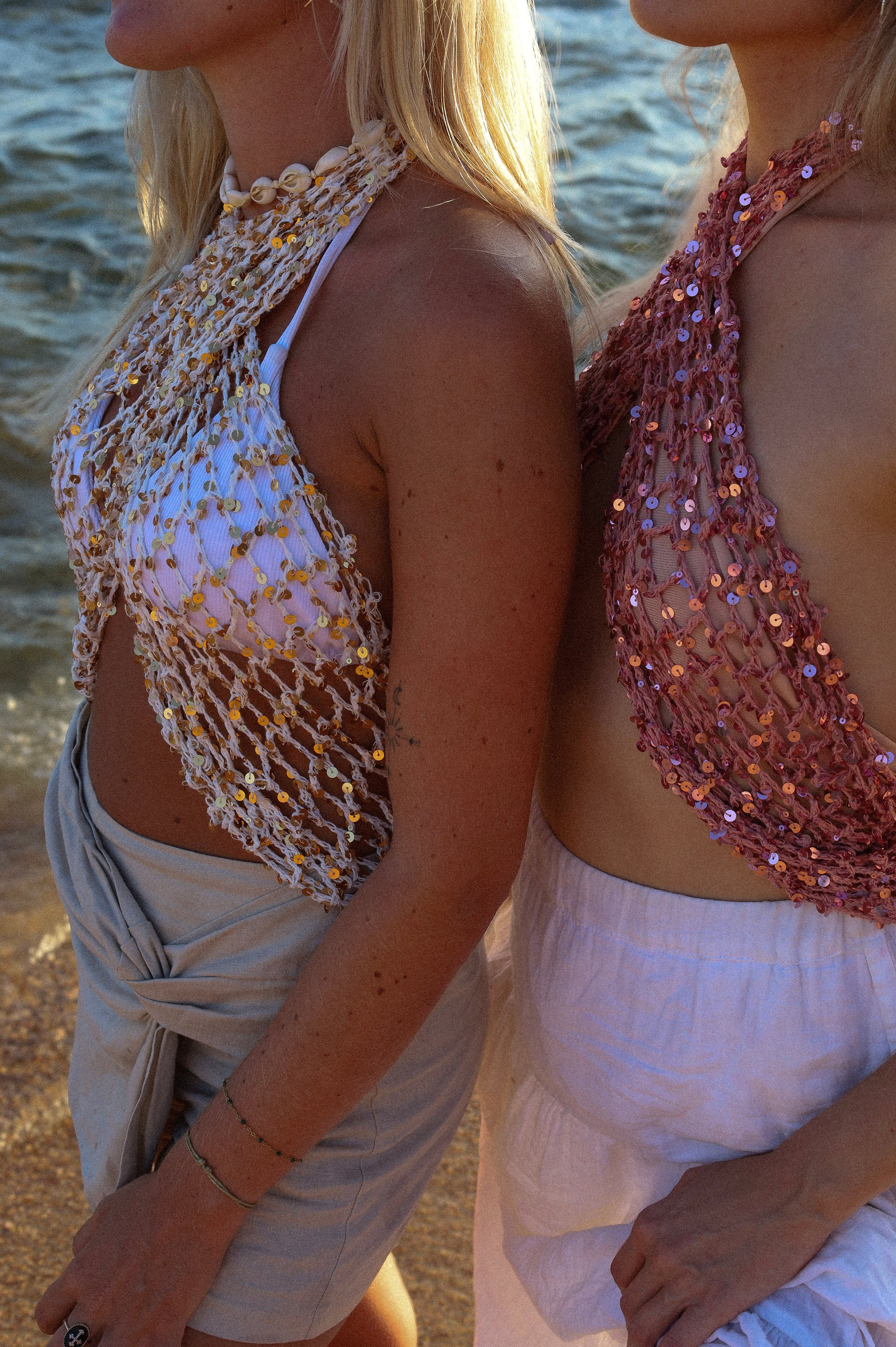 Le paréo ghjulia est un paréo 100% coton blanc à sequins doré, c’est une pièce unique qui peut se porter aussi bien en bandana, ou en haut croisé sur le devant
