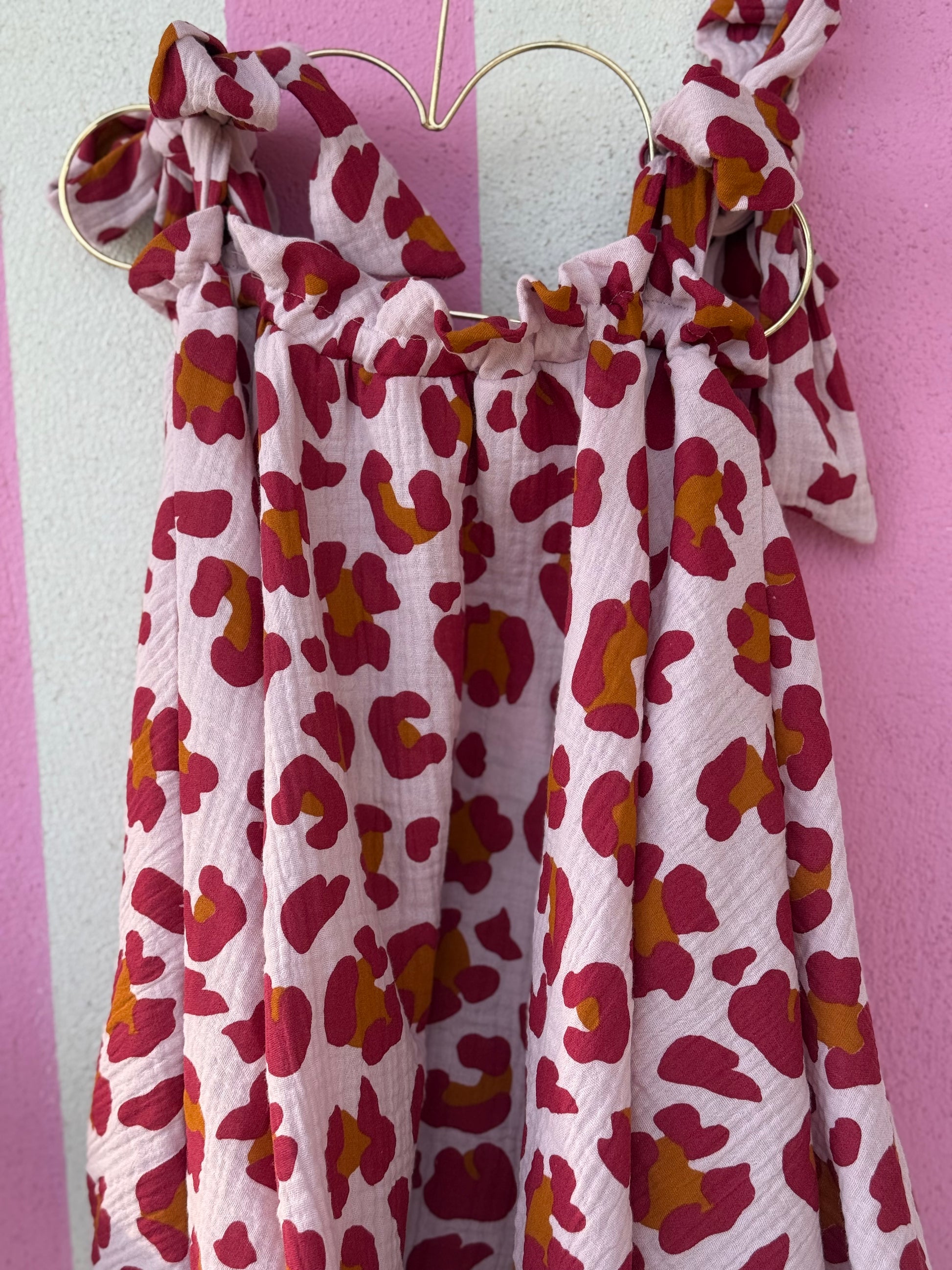 Son imprimé léopard revisité dans des tons pétillants de rose, rouge et moutarde apporte une touche originale et joyeuse, loin du classique. Les bretelles à nouer ajoutent une note délicate et permettent d’ajuster facilement la robe pour qu’elle accompagne l’enfant plus longtemps.